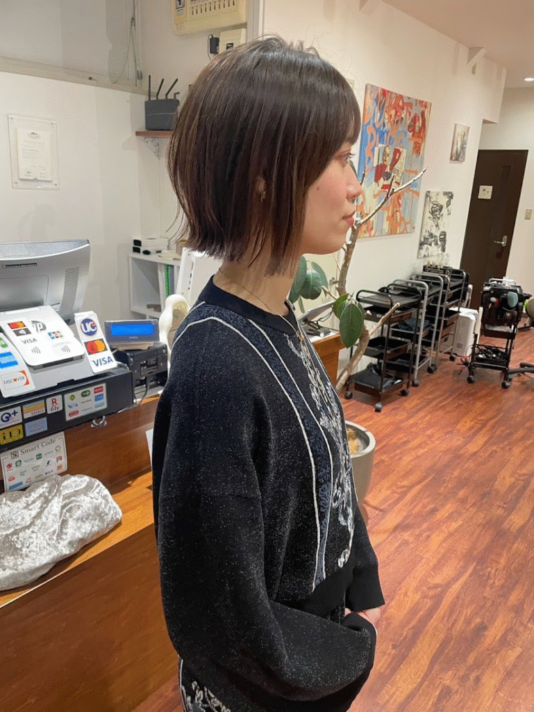そんなとき、外ハネボブのスッキリしたフォルムは襟元のデザインを邪魔せず、むしろ全体のバランスを引き立ててくれるんです。