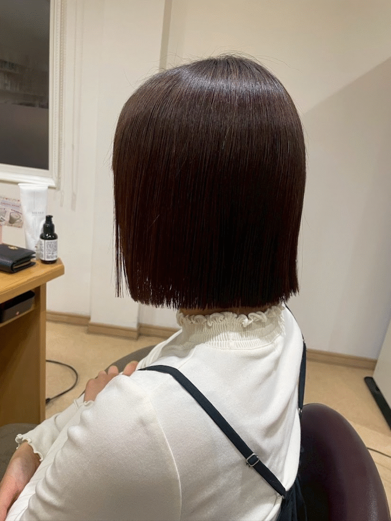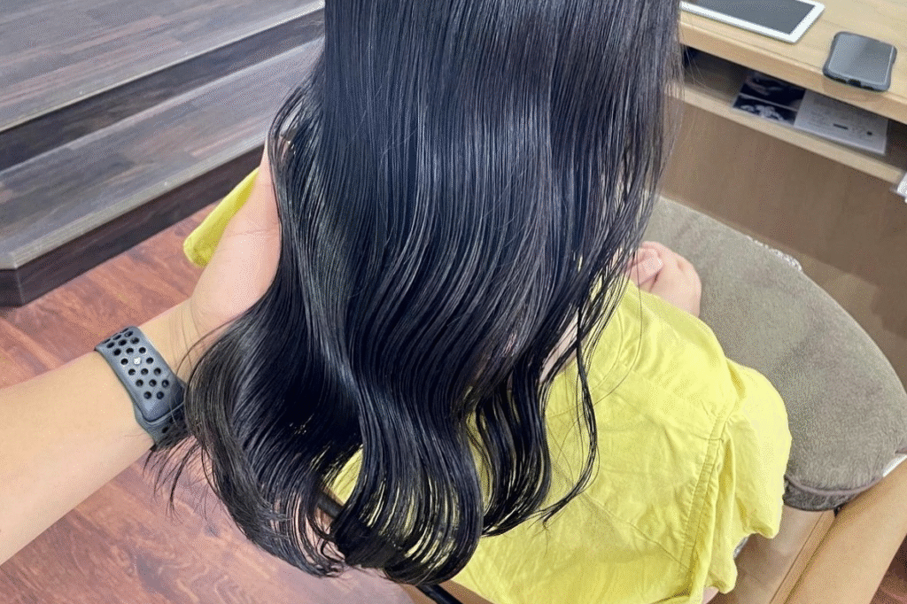 黒髪に近い深さの中に青みを潜ませることで、光に当たったときだけ透けるような透明感を楽しめます。清楚さとモード感を兼ね備え、秋のシックな装いを格上げします。